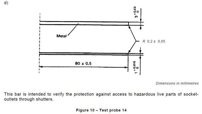 Test Probe 14 is intended to verify the protection against access to hazardous live parts of socket-outlets through shutters.