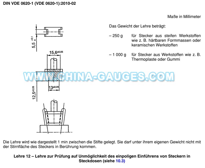 Lehre 12 –Lehre zur Prüfung auf Unmöglichkeit des einpoligen Einführens von Steckern in Steckdosen